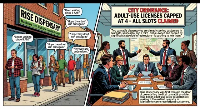 Two cannabis dispensaries are already serving customers in Mankato, Minnesota, and a third - tribal-owned and backed by significant statewide infrastructure - is pushing to join them. With city ordinances capping adult-use licenses at four and officials signaling that all available slots have been claimed, the small southern Minnesota city has quietly become one of the state's more contested retail cannabis markets.